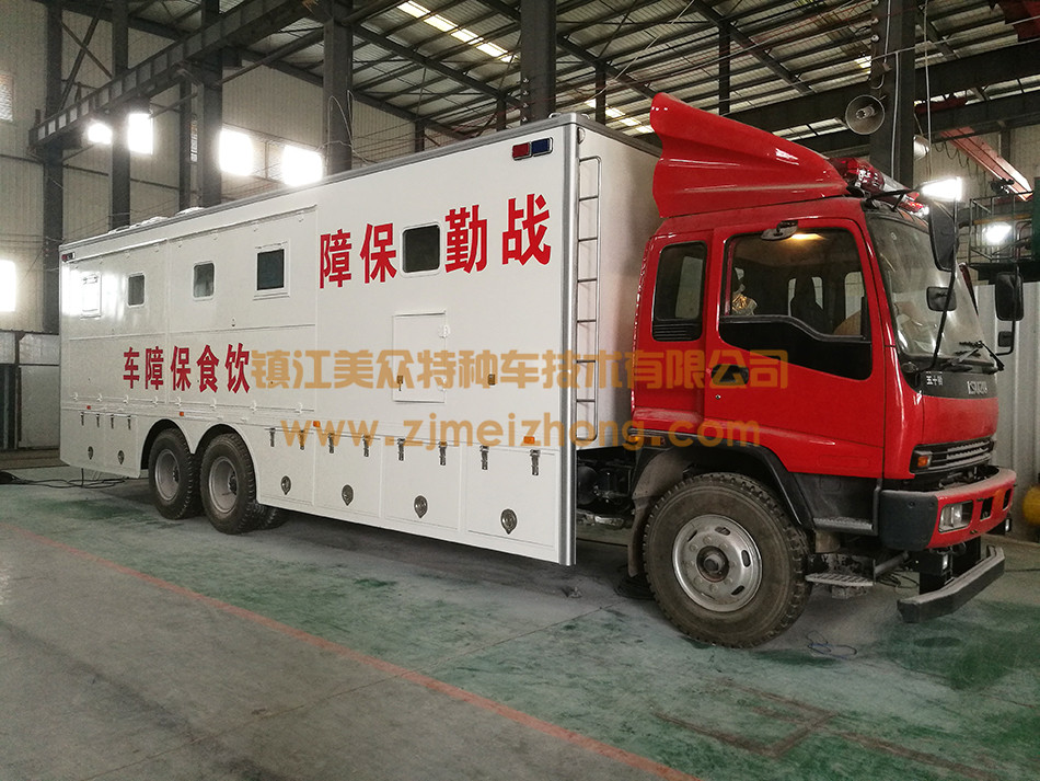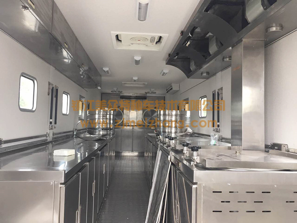 炊事車里面設有灶具、供水系統、食物儲存裝置、通風和安全防火等設施。一般按用途分為三種類型:固定式炊事車,可長期制作日常膳食。